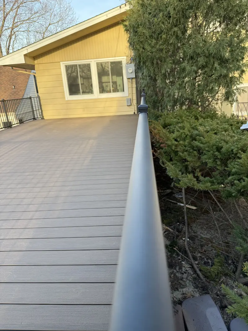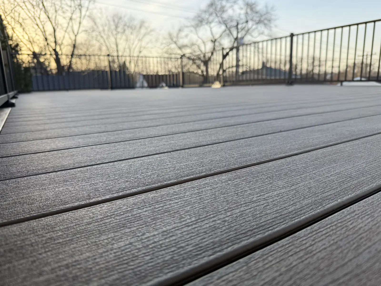 The gray composite boards give the deck a clean, modern look and pair well with the black railing system. The finished surface feels simple, but that is the point. It looks clean without fighting the house.