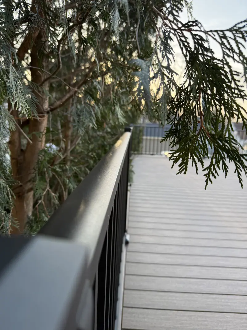 View Deck MaterialsThe black aluminum railings are a big part of what makes this deck work visually. They give the elevated space the safety it needs, but they do not make the deck feel boxed in or heavy.