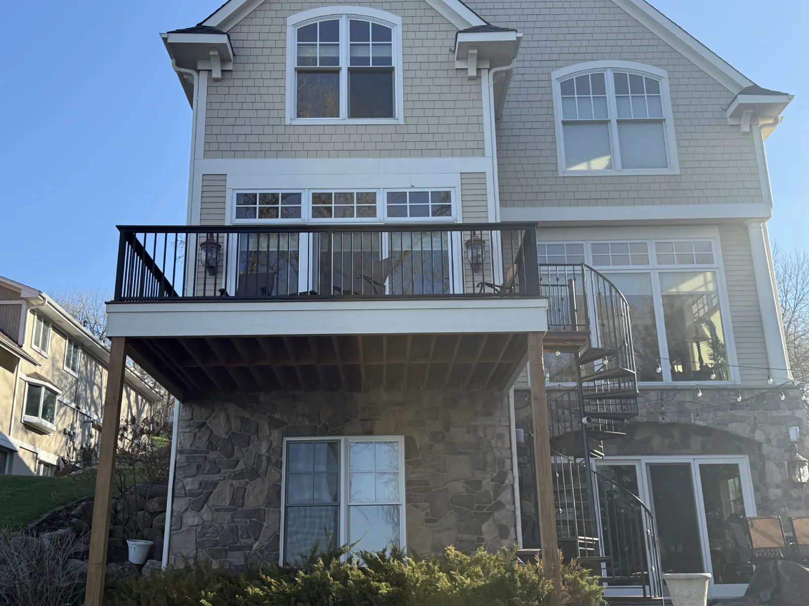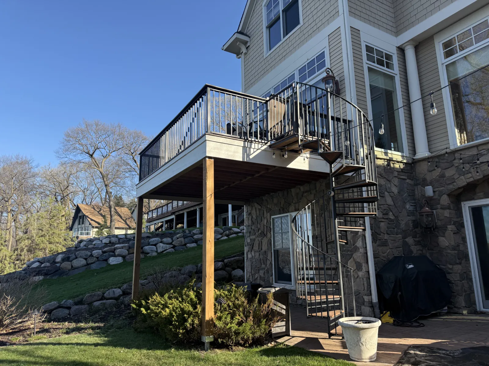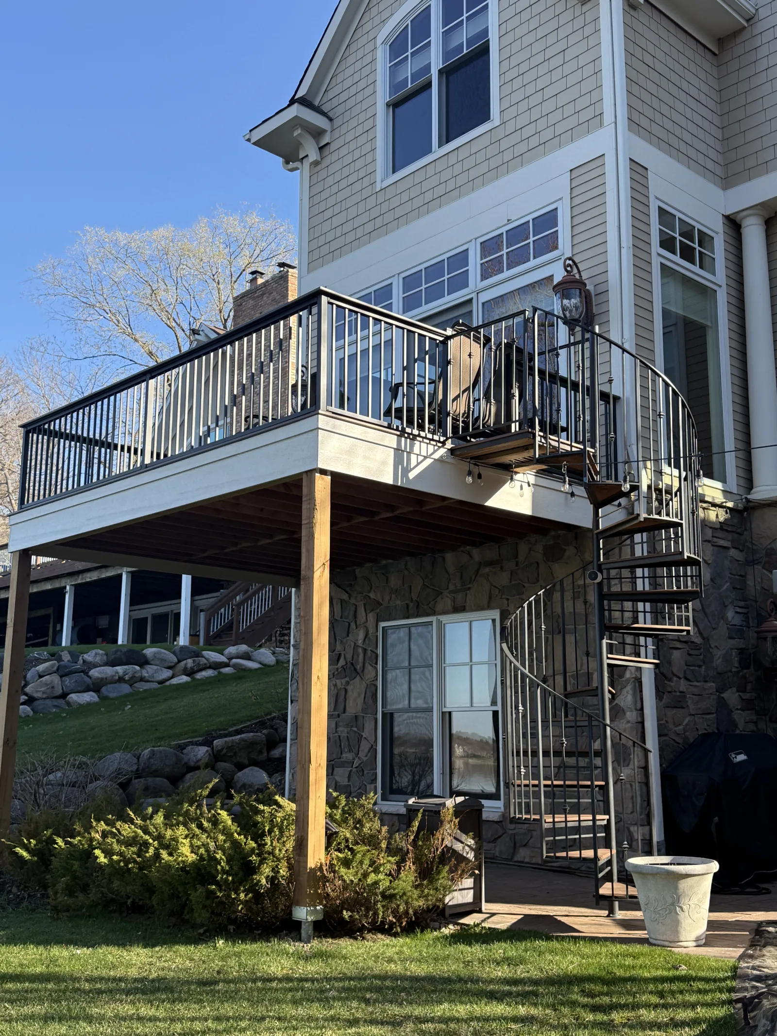 The finished build includes a composite deck surface, black aluminum railings, and a spiral staircase that connects the upper deck to the lower patio without taking over the whole yard. Everything about the project feels cleaner, more usable, and better matched to the house.